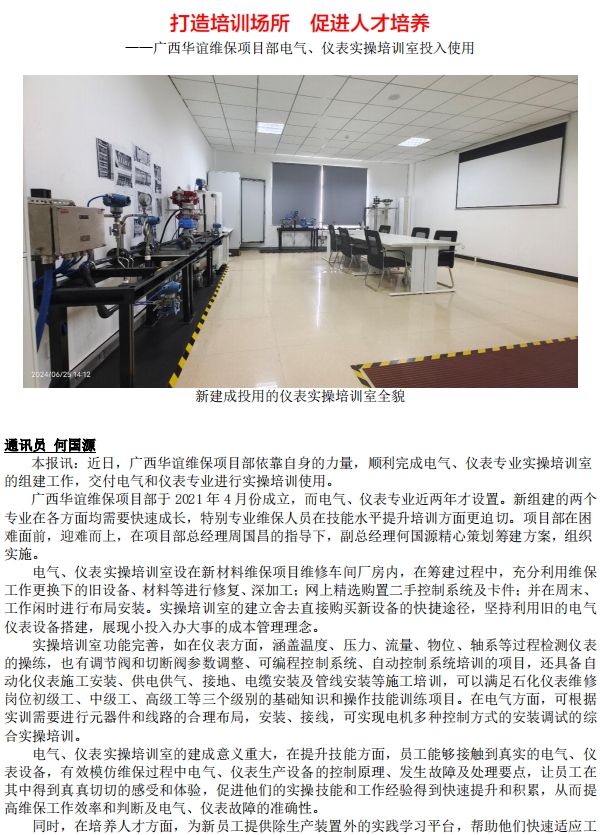 廣西(xi)華誼(yi)維保(bao)項目(mu)部電(dian)氣、儀(yi)表實(shi)操培(pei)訓室(shi)投入(ru)👋使用(yong)